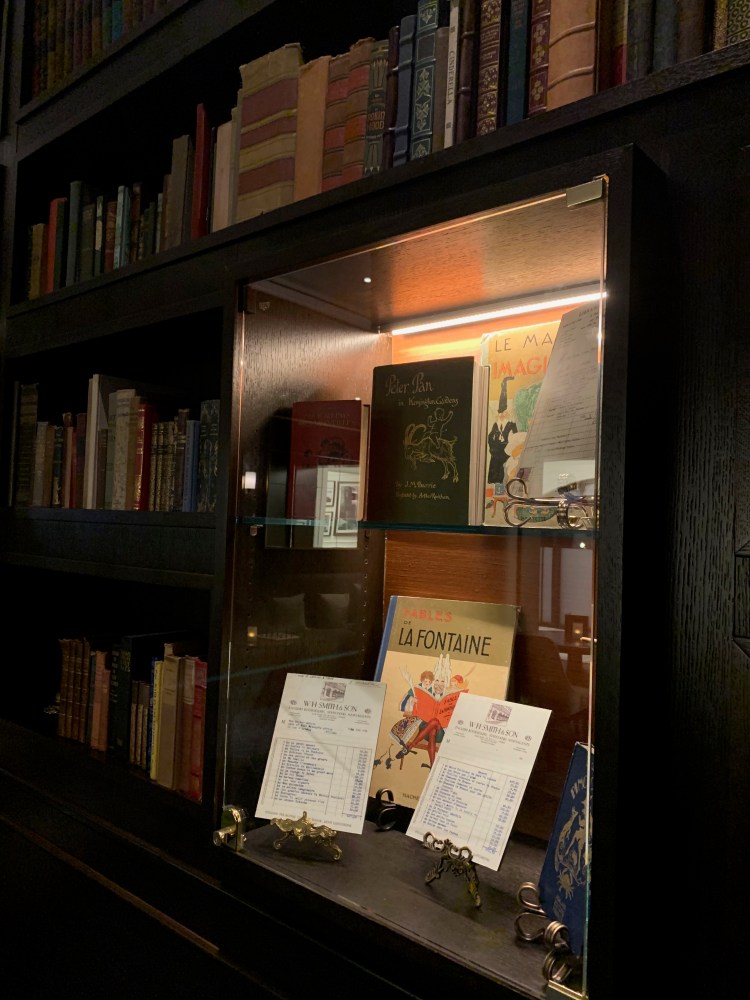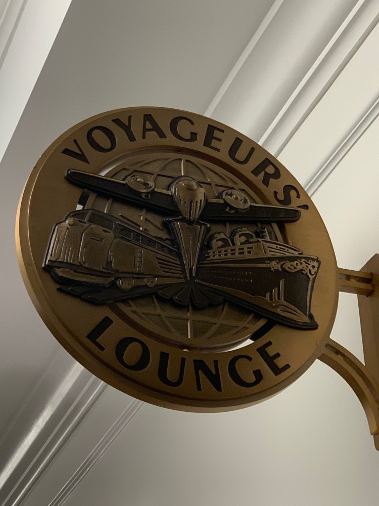 If it’s raining and you still want a pre-dinner respite, take your drinks to the Voyageurs’ Lounge, just to the left of Le Petit Cafe when you turn to the exit from the register. It’s a quiet space with board games, lots of outlets if you need to charge up or want a daytime workspace, and lovely displays of Disney memorabilia in French and Italian.