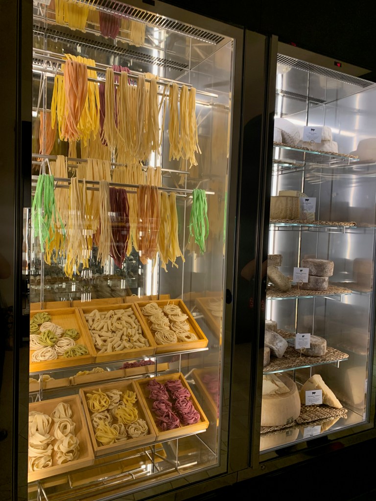 Then it’s time to head upstairs for the main event. Stepping off the elevator, you’re greeted not just by the host stand, but by glass cases that feature wine and mouthwatering fresh pasta and cheese.