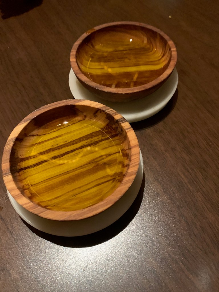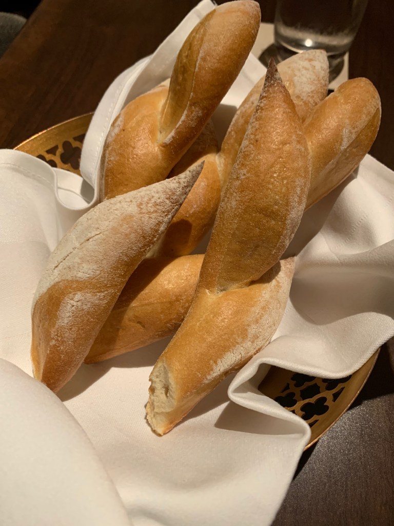 With the drinks, they brought their signature bread that’s braided to look like a wheat stalk. The bread itself wasn’t very flavorful, but they also presented two types of olive oil—a standard Italian and a supercharged French that had a stronger OLIVE flavor.