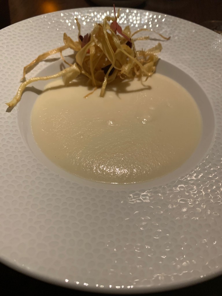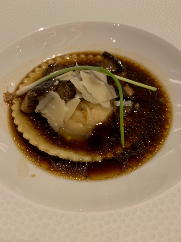 The root bisque was just as it should be, smooth and deep, though the vegetable accents were more chewy than crunchy. The pumpkin ravioli itself was delicious: one giant raviolo, really, with a rich pumpkin filling and an herbal top note (sage?—the server wasn’t sure), but the brodo they poured in at the table overpowered the pumpkin. The star of this course was the salad; grilling the figs gave the whole dish an earthy foundation that elevated it beyond a simple salad.