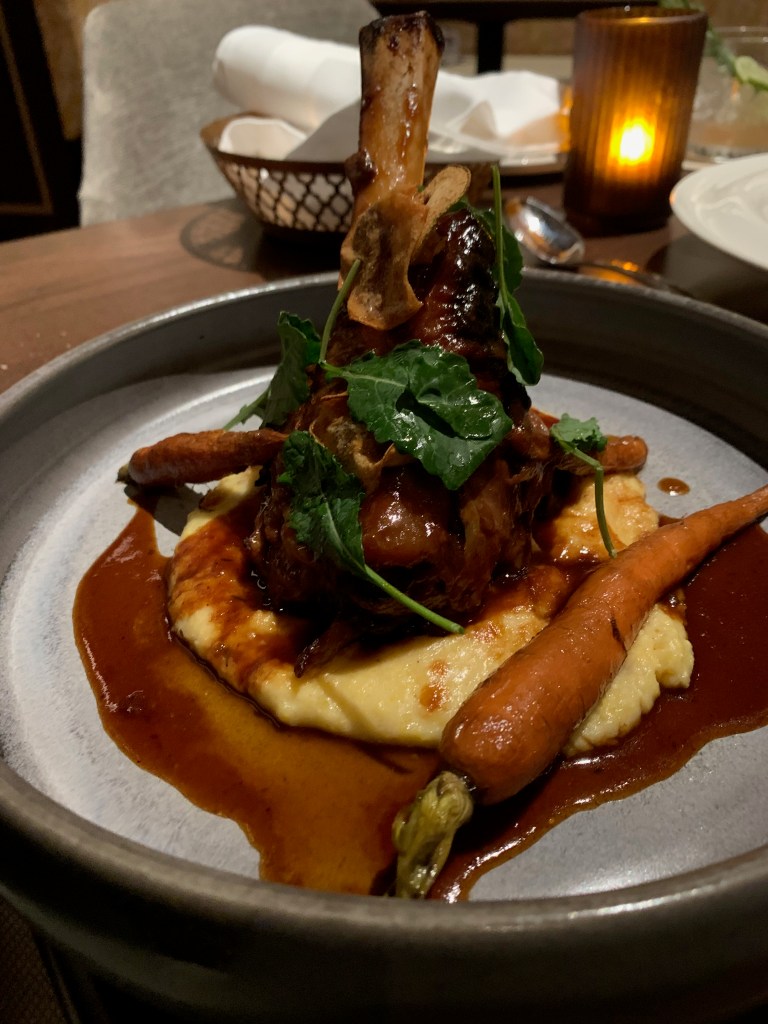The lamb shank was perfect for a “Florida cold” night, fall-off-the-bone tender in a rich jus, melting into the creamy polenta. A few more of the dehydrated pears would have been nice, as that’s the most unique feature of the dish, but it’s something I’d happily order again—though I think on my next visit, I’ll be getting the absolutely massive tomahawk veal chop that I saw a server carrying by our table.