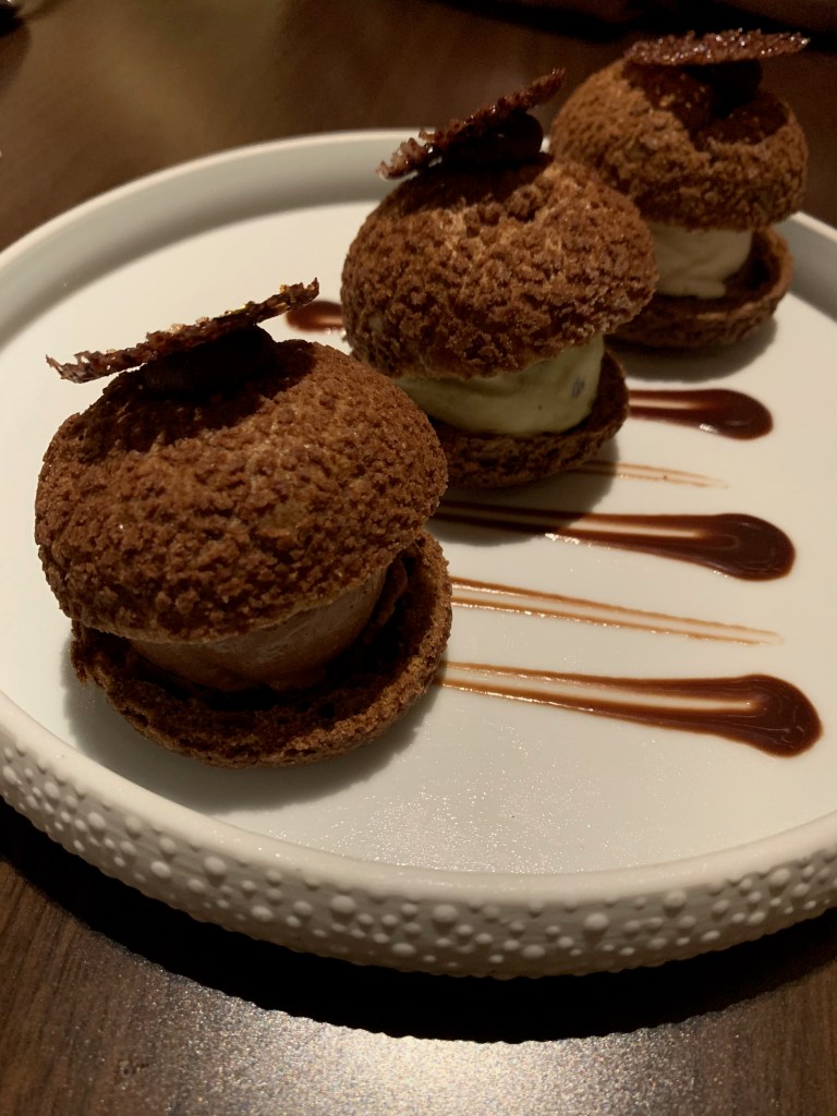 For dessert, we ordered the pistachio mousse and profiteroles. The mousse was unfortunately too sweet and lacked the nutty pistachio flavor I craved, although the Morello cherries that garnished the plate were tasty. But that pistachio flavor was fully present in the gelato in the profiteroles; each pastry puff had a different flavor—the others were caramel and chocolate (preferred by my mom and sister, who don’t share my odd, savory-forward taste in desserts).