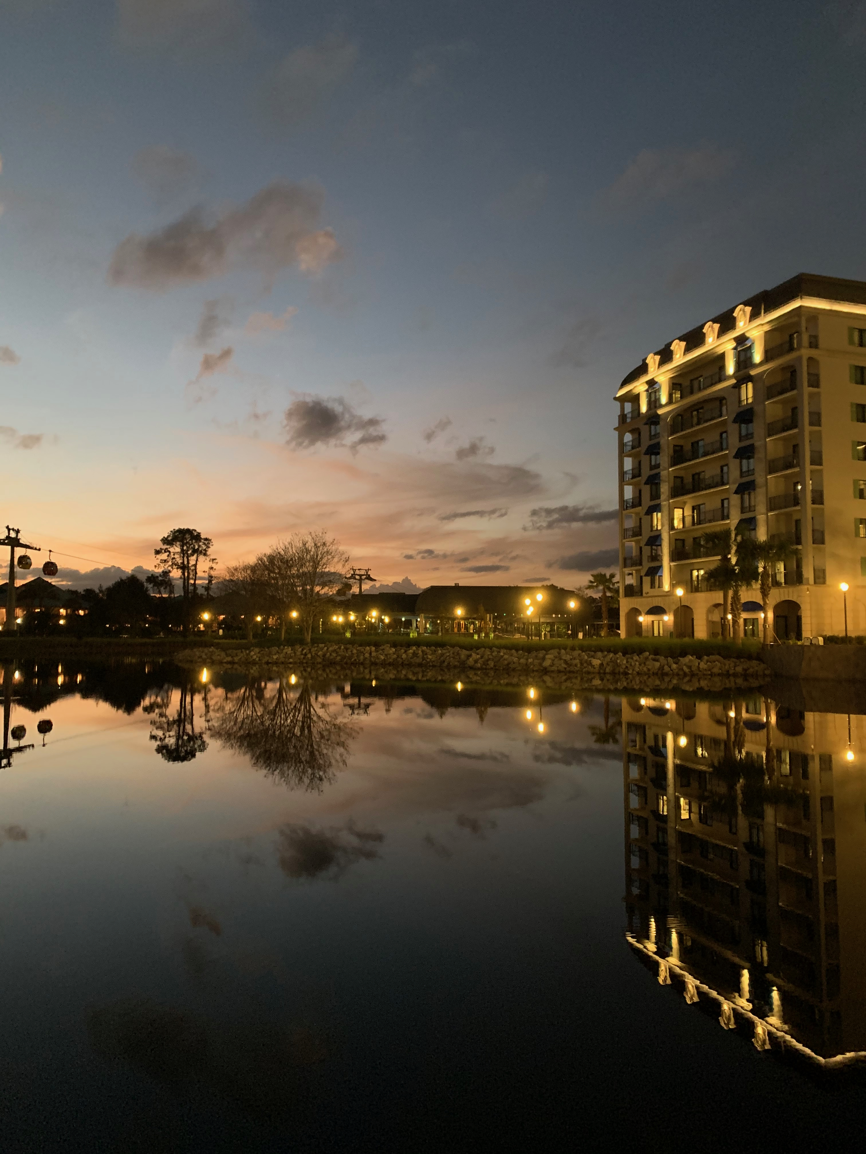 With your drinks in hand, go down one more level, and walk out. Go past the bocce ball court, and follow the path straight ahead to a few small tables they’ve placed by the water. Perhaps it will fill up when more people try the new hotel, but we had the area almost entirely to ourselves. My Aperol Spritz was perfectly balanced and refreshing, my sister enjoyed her Mediterranean Margarita (though she thought it tasted pretty much like a regular margarita), and Mom’s Pomegranate Paradiso was strong but sweet. The best part, though, was the view at dusk, and even though we were sitting by a lake in Florida instead of by the sea in France or Italy, it did truly feel…just a little bit…like we were relaxing with our cocktails by the Riviera.