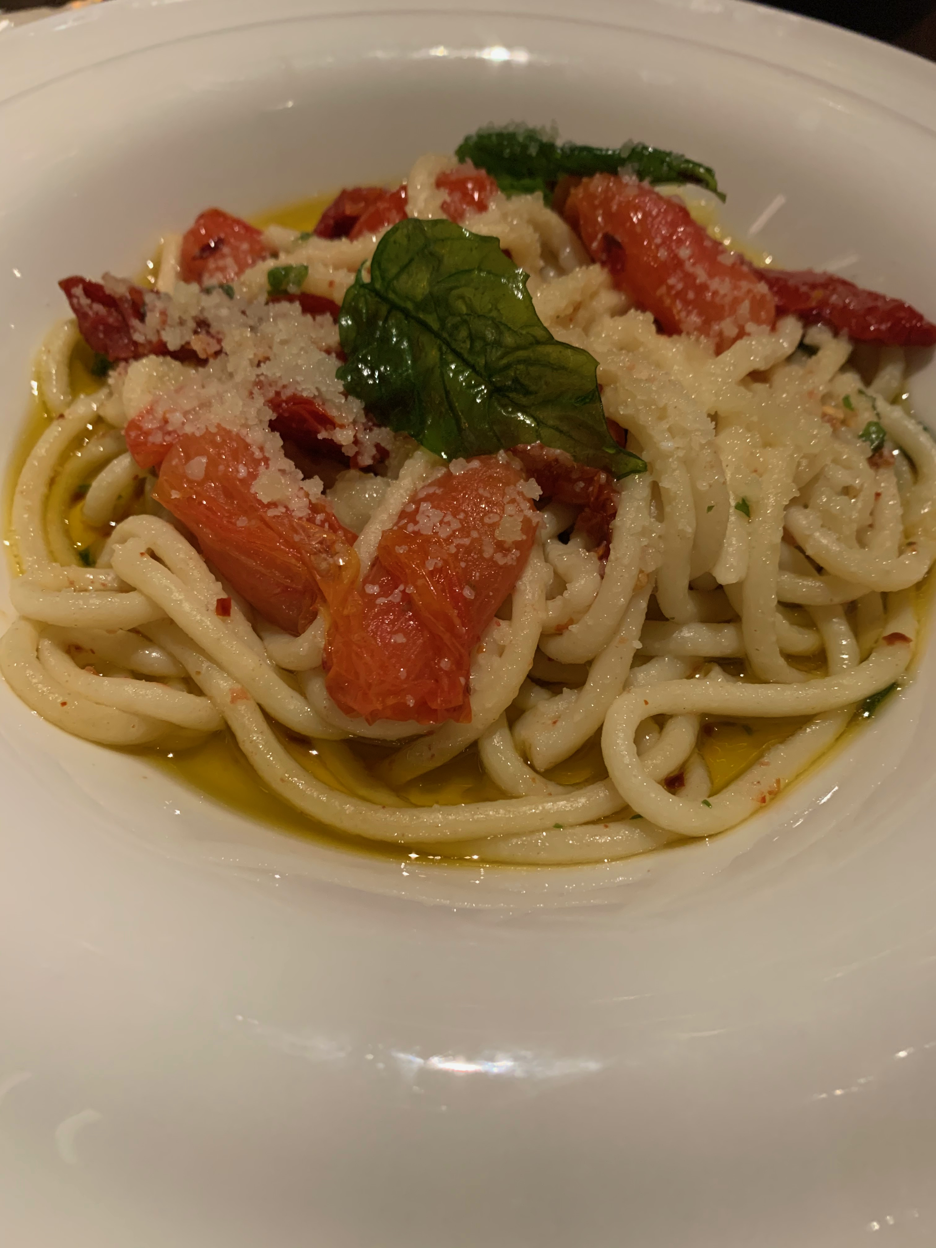 Our appetites dwindled to just two dishes with the main course: I had the braised lamb shank, and my sister tried the bucatini. Seafood is never my first choice, and I was a little disappointed to see that the pasta selection isn’t as large as I’d hoped, given how it’s featured in the entryway, and includes shellfish in half the options. But the bucatini was well cooked and extremely fresh tasting, although we would have enjoyed more spiciness from the Calabrian chiles.