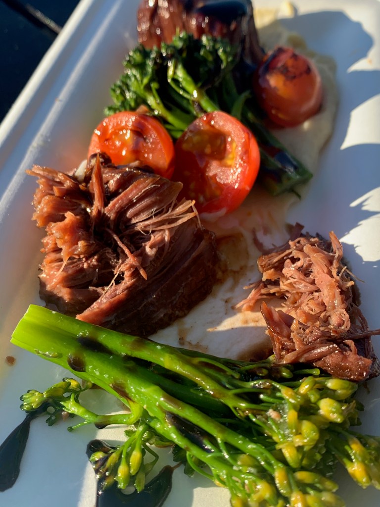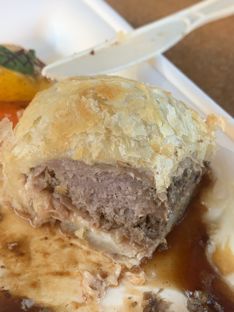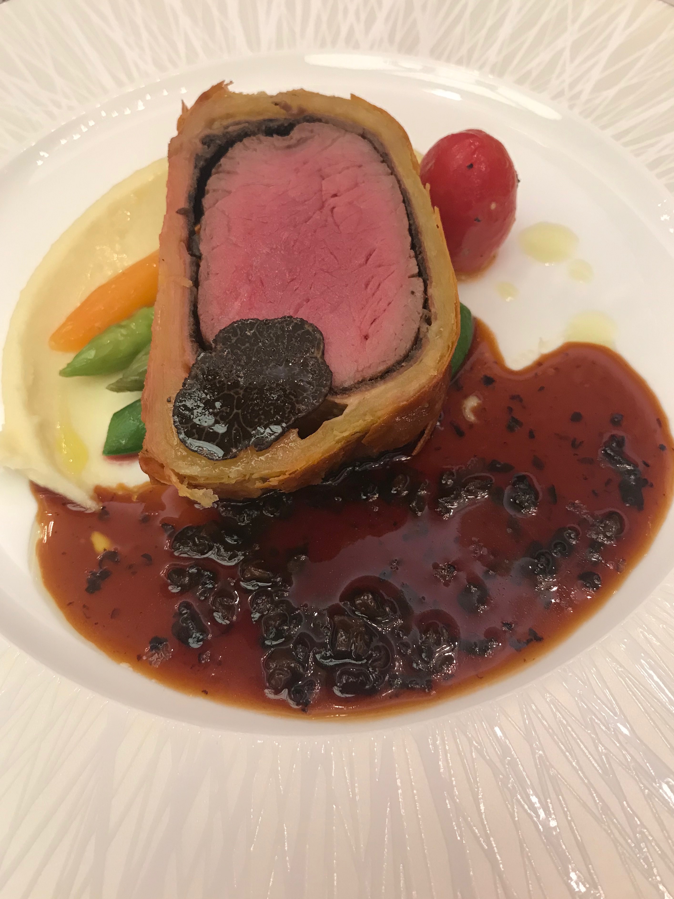 I was excited for the Beef Wellington; it’s one of my favorite dishes, and it’s far too labor intensive for me to make at home. The flavor was solid, but the meat was overcooked, and the presentation could have been a bit prettier. For contrast on both fronts, the photo on the right below is of the fantastic Beef Wellington I had at the Club 33 at Shanghai Disneyland. I enjoyed the mushroom bordelaise and the crisp of the roasted vegetables but would have liked a slightly stronger fennel flavor from the cream.