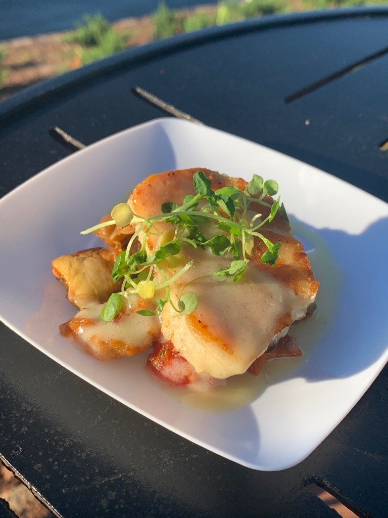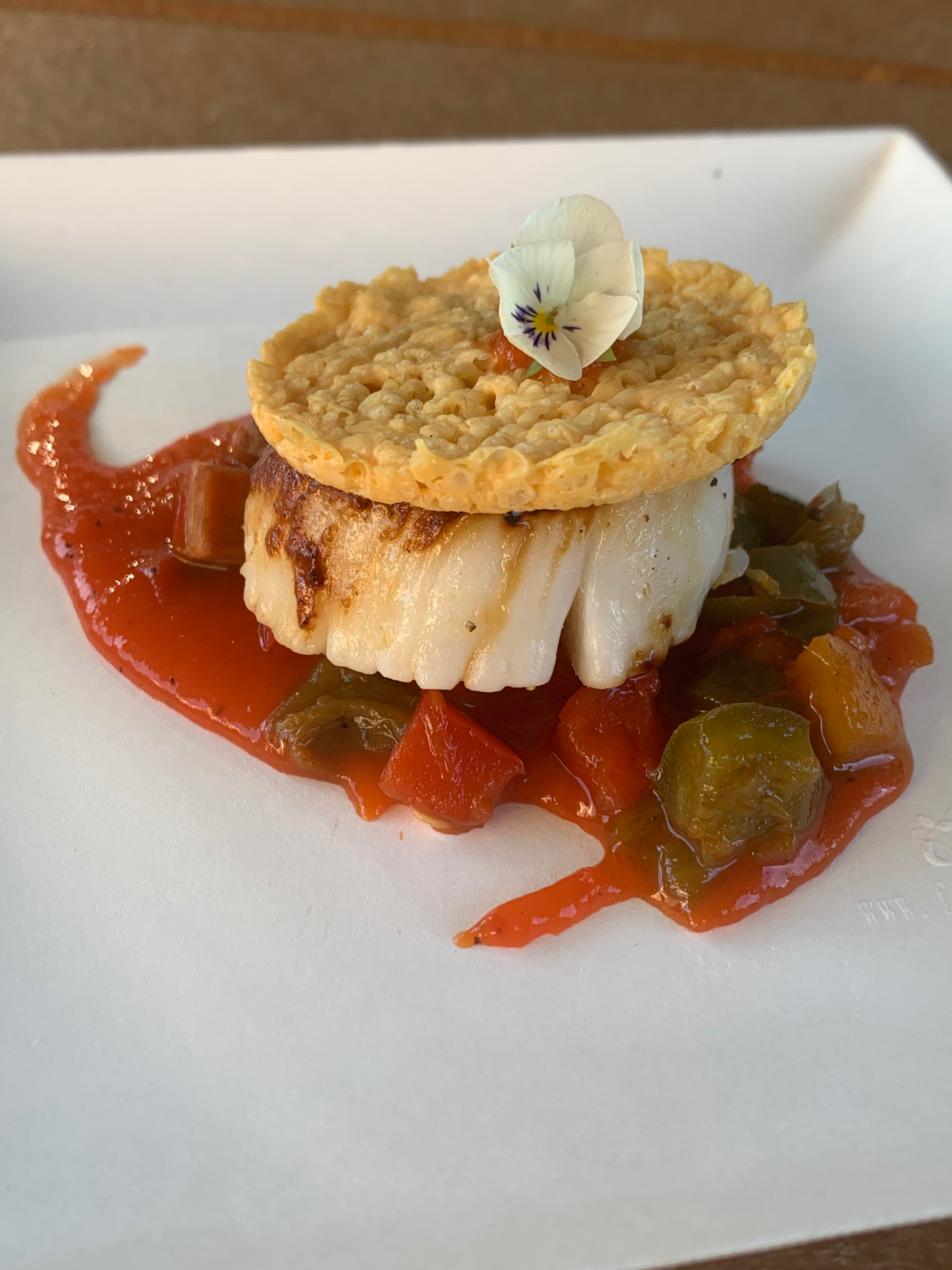 The scallop at The Artist’s Table is possibly the most beautiful dish at the Festival of the Arts. The flower balanced on top of the Parmesan crisp that rests on the expertly seared scallop, all on the bright red of the pepper coulis, is visually stunning.