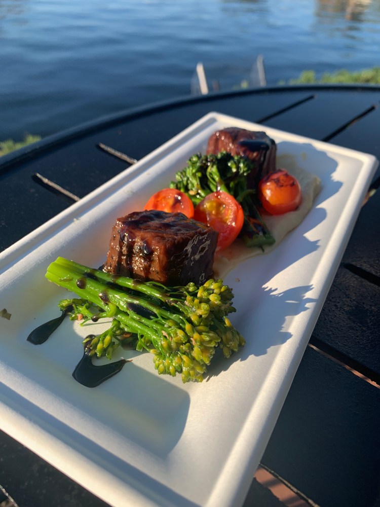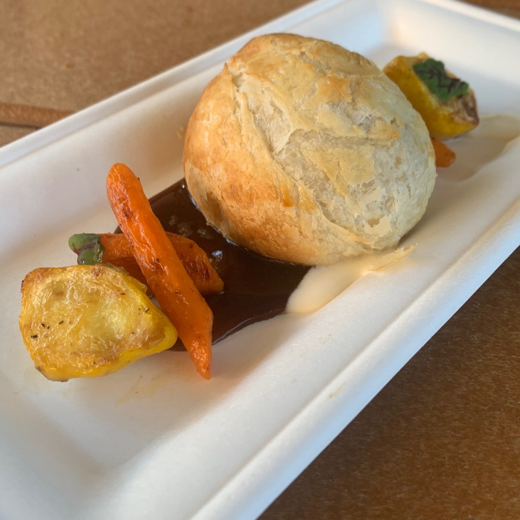 Two food booths at Epcot’s Festival of the Arts feature both seafood and beef, creating the possibility for a delectable surf and turf flavor combination. The Artist’s Table, in America, presents “Beef Wellington with with Mushroom Bordelaise, Fennel Cream, and Roasted Baby Vegetables” and a “Pan-Seared Scallop with Chorizo, Roasted Red Pepper Coulis and a Parmesan Crisp.” At the Cuisine Classique booth in Germany, you can try “Red Wine-braised Beef Short Rib with Parsnip Purée, Broccolini, Baby Tomatoes and Aged Balsamic” and “Seared Corvina with Braised Ratatouille and Lemon-Thyme Beurre Blanc.” You can tell from the descriptions that they have somewhat similar flavor profiles, but one booth’s food tasted notably more delicious.