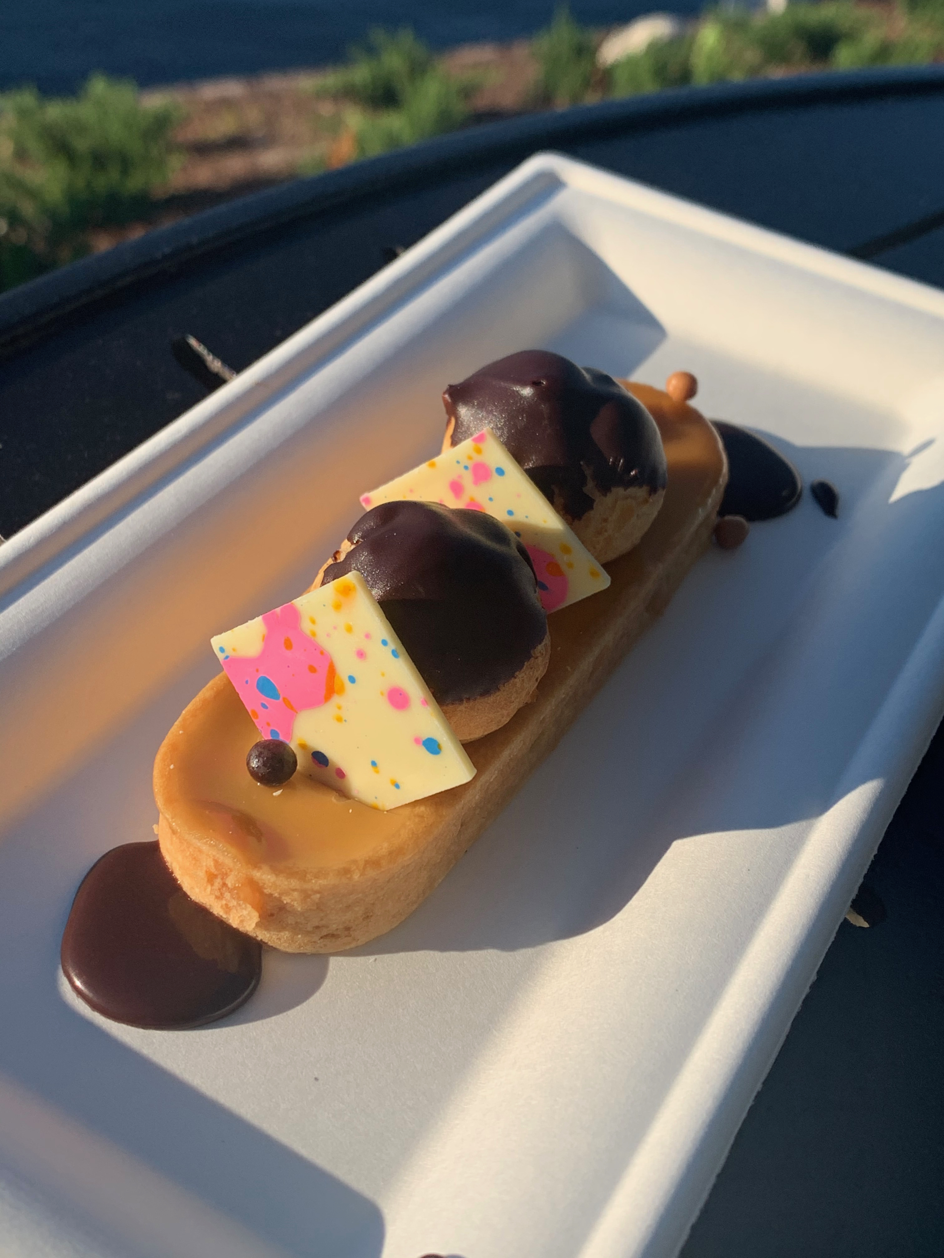 As a bonus, Cuisine Classic has a distinctive dessert, the “Saint-Honoré Tart: Caramel Cream Tart with Caramel Glaze topped with Cream Puffs,” which I was much more eager to try than the drinking chocolate or cookie at The Artist’s Table. This tart actually gives you two desserts in one, with the cream puffs adorning it. The flavor of the pastry overpowered the caramel to some degree, but it was a pleasant end to the meal.